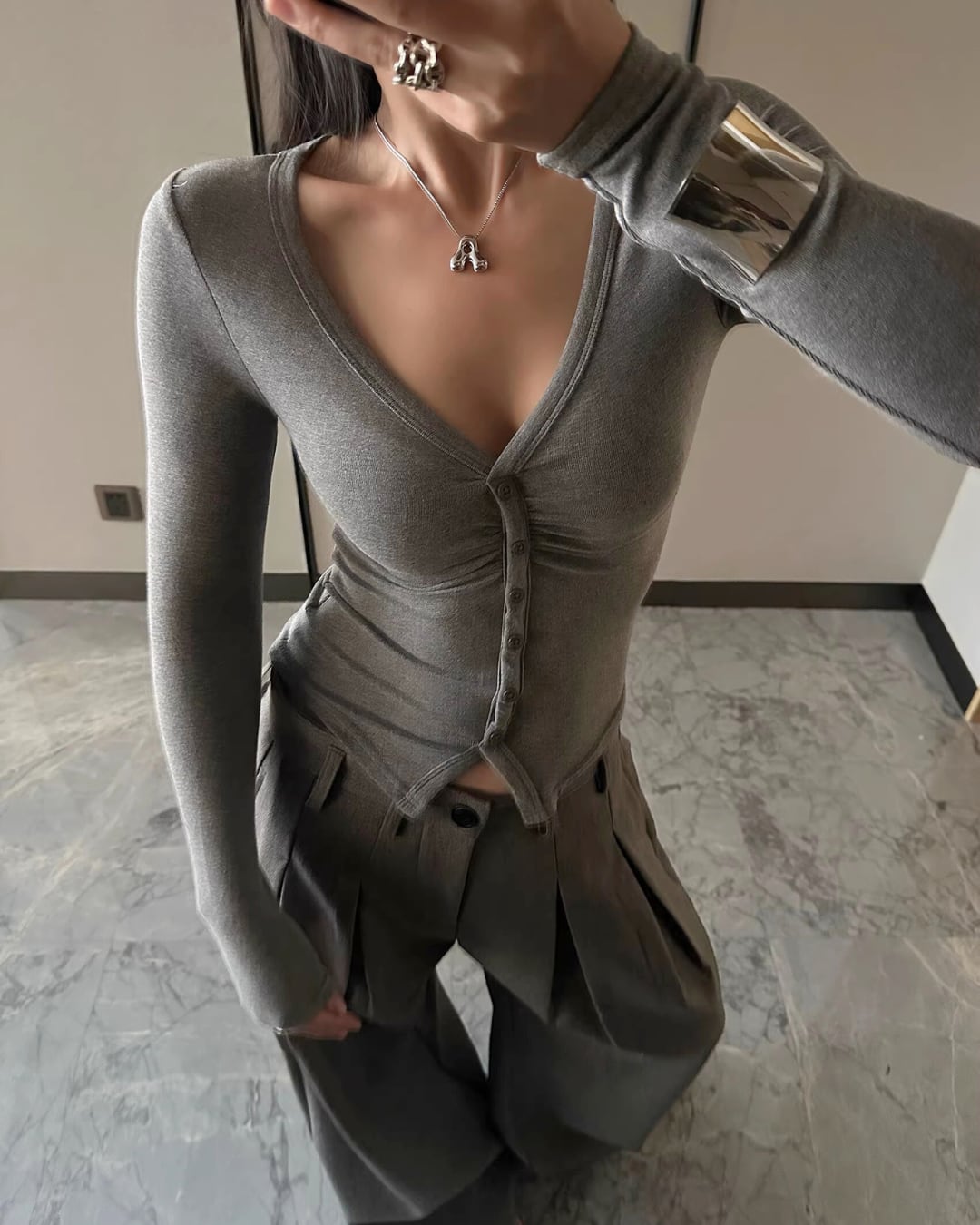 Vネックフロントボタントップス